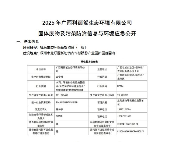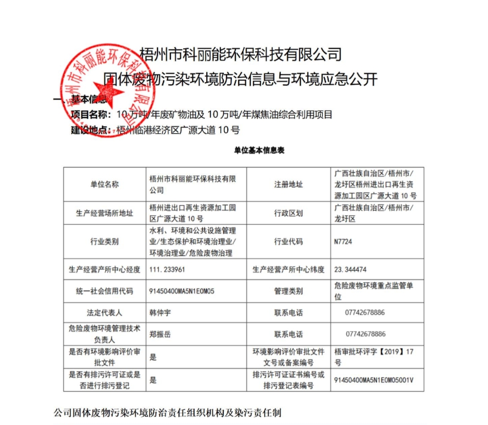 梧州市科丽能环保U技有限公司成立?018q??0日,位于梧州市龙圩区梧州q口再生资源加工园区内,业务늛危险废物的综合利用与环保技术服务支持。目前已具备废矿物aQHW08Q、煤焦aQHW11)两大cd险废物经营资质,危险废物处置能力辑ֈ20万吨/q_其中废矿物a10万吨/q、煤焦a10万吨/q?br>